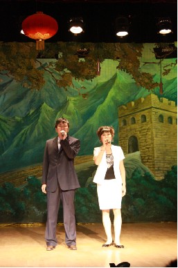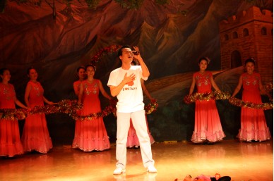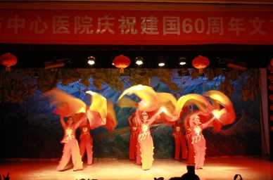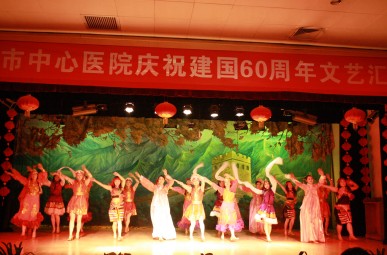 9月24日下午,我院四楼多功能厅灯火辉煌,气氛热烈喜庆。在这里全院职工与院领导齐聚一堂,隆重举行庆祝建国60周年文艺演出。      市卫生局副巡视员何新民、政治处处长王力平、市教科文卫工会主任姚宏、市新城区宣传部副部长、文明办主任陈文正、市新城区文明办副主任范晓风参加了我院文艺汇演,兴致勃勃地观看了我院各支部及医院舞蹈队在百忙之中自编自演的文艺节目。      演出在一支部所有大内科主任及护士长带来的大合唱《祝福祖国》的雄壮歌声中拉开帷幕。院领导铿锵有力的小合唱《绣红旗》、《革命人永远是年轻》把现场的气氛推向了高潮。离休支部的老同志带来的歌伴舞及大合唱让现场所有的领导和职工为之动容,其中年龄最大的已经88岁高龄,更加激起了全场一阵又一阵的热烈掌声,优雅、端庄、文明、整齐、和谐的气氛,感染着台下每位职工。文艺汇演中穿插的学习实践科学发展观活动有奖问答,也成为本次活动的一个亮点,广大职工积极踊跃的举手抢答,增强了文艺汇演的互动性,也使广大职工学到了科学发展观知识。      欢快的舞蹈,颇具专业水准的独唱、独奏……展现共和国60年的光辉历程,歌颂改革开放三十多年来的辉煌硕果。异彩纷呈的节目,不时赢得大家的阵阵掌声。本次文艺汇演在一片祝福声中圆满结束,愿祖国的明天更美好,愿我院各项事业更好更快健康发展!                                                                             (王丹)