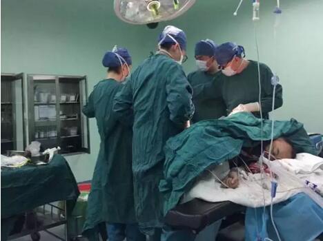 方案确定后,迅速由呼吸科李东繁主任医师行支气管镜检查后,发现右侧支气管内可见血性液体涌出。徐涛主任分析后认为出血位置在右肺,面对巨大的压力,经过斟酌考虑,他敢于担当,果断做出决定:行右侧开胸探查止血术。在向患者家属告知病情并家属同意手术后,由李副书记向虎威院长做了汇报,虎威院长当即指示:应不惜一切代价全力以赴抢救病人,只要有百分之一的希望,我们一定要尽百分之百的努力!命令如军令!徐涛主任遂立即安排行右侧开胸探查手术,由麻醉科主任崔晓岗主任医师亲自麻醉,徐涛主任主刀,钟守平副主任医师等为助手。术中,打开胸腔后探查见:右侧胸腔内可见大量积血,气泡自肺门处冒出,吸尽积血,发现右肺中叶支气管破裂伴出血、上叶前段肺裂口伴出血,中叶支气管难以修补,遂立即予以右肺中叶切除及上叶前段肺修补术,经过两个小时紧张的手术,手术顺利,术后患者血压渐趋稳定,口鼻腔及气管内出血停止,平稳后患者安全返回胸外科ICU。