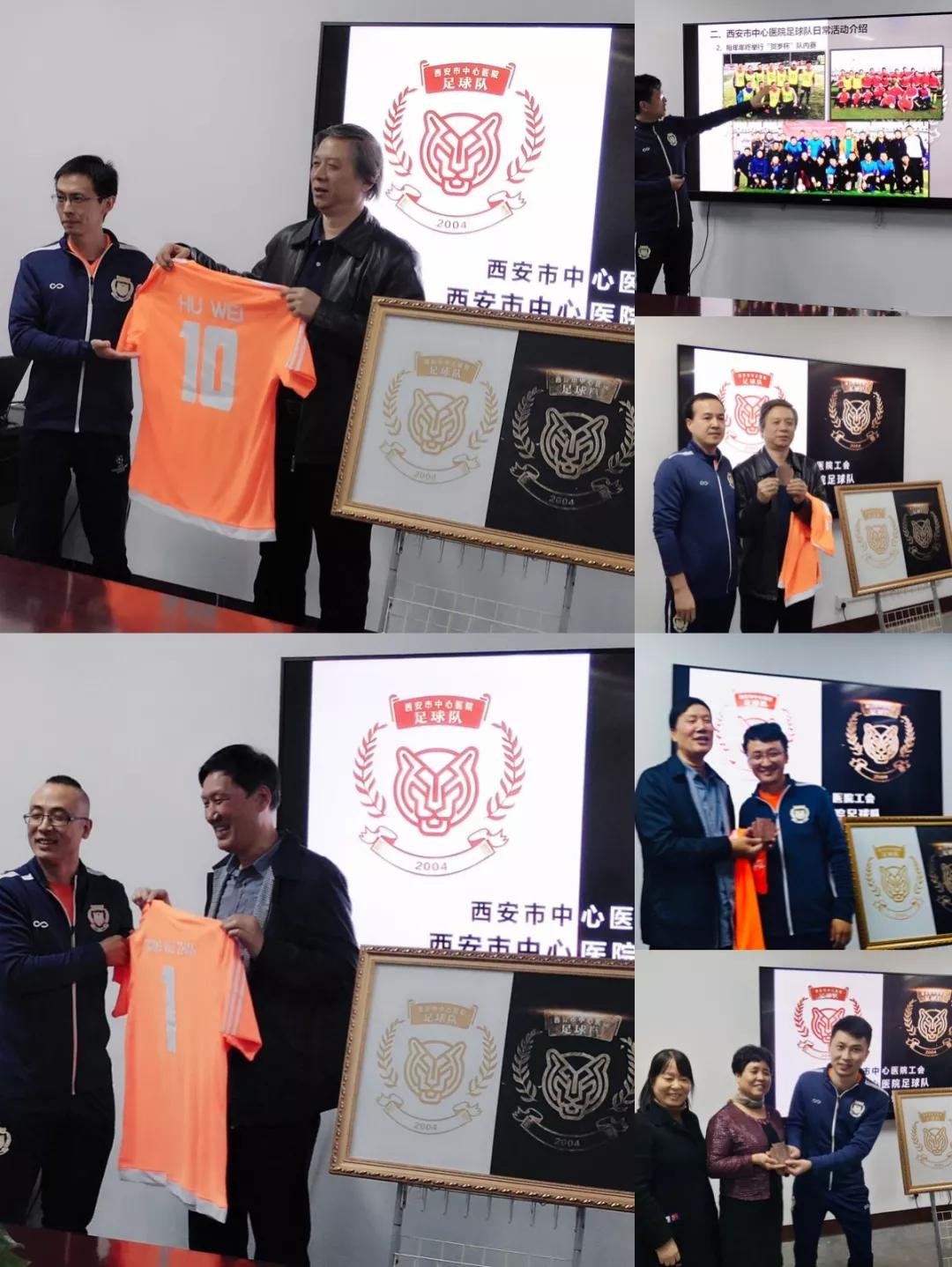 首先,足球队队委会教练黄新介绍了球队的成员、训练、比赛交流的情况:91论坛 足球队自2004年建队以来,每周坚持训练近15个年头,历经寒暑易节,人员更迭,仍不忘初心,努力拼搏。始终把“锻炼与学术并重,足球与学术起飞”作为球队的建队方向和口号,多年来坚持不懈。之后,王书记做了重要讲话,肯定了我院足球队多年以来坚持不懈训练的精神,并借本届新的工会成立的契机,对我院足球队发展表示关怀和支持,提出更高的要求:以足球队为代表,体现医院职工的凝聚力及医院全面发展的文化内核,奋进超越,与时俱进。随着王书记和虎院长与我院足球队队委会成员举行球队队徽揭牌仪式,标志着我院足球队正式成立,纳入我院工会管理。随后虎威院长也发表了重要讲话,虎院长说:球队是我院的缩影,代表着我院精神,队徽有猛虎,比赛也要如虎似狼,不仅球队要成为虎狼之师,在临床工作上我们也要有如狼似虎的拼搏精神。之后,队长孙为及队长付锋勃分别向虎院长赠送“10号”队服及队徽,特聘虎院长为荣誉队长。领队张立新及领队崔鑫分别向王书记赠送“1号”队服及队徽,特聘王书记为荣誉领队。教练郑南波向两位工会副主席惠再娥及肖瑛赠送队徽。最后,整齐划一地身着新队服的英姿勃勃的球队队员与工会成员及院领导集体合影,仪式圆满结束。