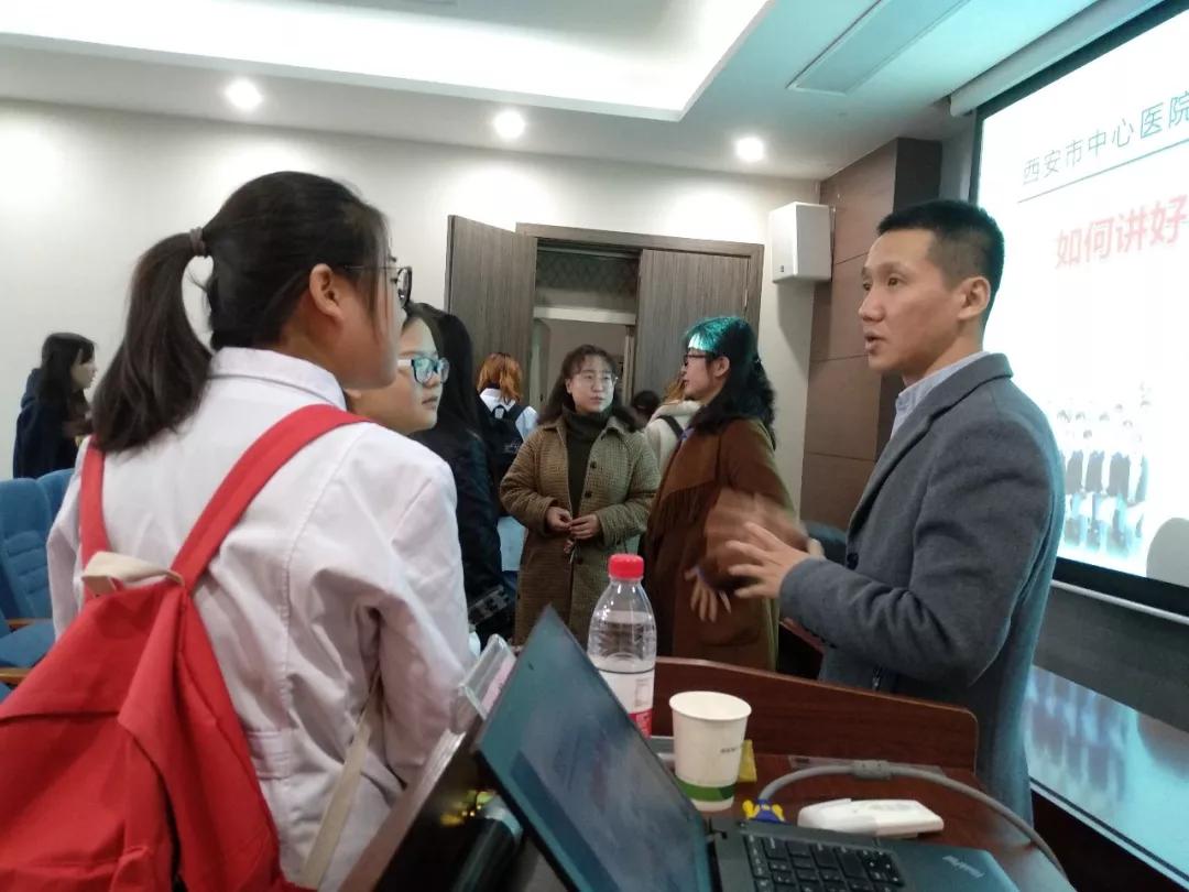 授课环节,杜主任为大家带来了期待已久的讲座,并对讲课全程进行了网络直播,留下了宝贵的影像资料,他为大家讲述“如何讲好一堂大课”,并巧妙穿插各种眼科临床实践和学科前沿知识,不时与台下同学互动,现场气氛十分欢快,声情并茂的讲课不时引发阵阵掌声。在场的老师们表示这堂课对她们今后授课提供了很多新思路、新想法,同学们也表示获益良多。