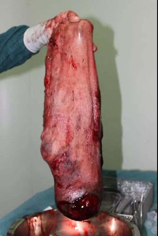 3月20日,在完善了术前检查及相关手术预案的前提下,患者进入了手术室。在麻醉科、普外科及输血科的配合下,由刘宾主任医师和陶谏主任医师带领的医生团队经过3小时的紧张手术,最终顺利的“拿下”了这条“长错了地方的尾巴”。这条“断尾”长40cm,重量达到了近10斤。由于术前多学科的精心设计和紧密合作,患者术中出血不到300ml,远远少于预期。目前患者恢复良好,自己都觉得:少了个“大尾巴”后,整个人一下轻松了不少。