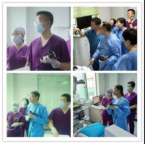 北京301医院的金鹏教授为学员手把手带教胃镜的精查,重庆新桥医院的杨歆老师与陕西省的各位学员交流内镜精查操作要点。