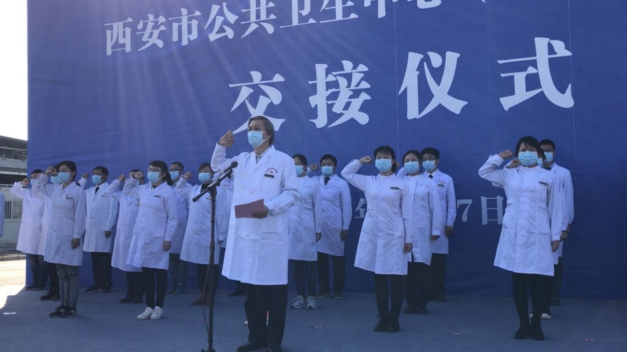 市公共卫生中心(应急院区)临时党委书记、院长虎威带领医护人员庄严宣誓:健康所系,生命所托!身为人民生命健康的守护者,我郑重宣誓:秉承医者仁心初心,牢记救死扶伤使命,无论任何岗位,无论任何时候,坚决服从组织安排;顾全大局,忠于职守;苦练技术,提高本领;科学防治,精准施策;迎难而上,不怕牺牲;团结奋斗,不辱使命!我们严阵以待,时刻准备着!若有战,召即来,来能战,战必胜,为人民群众生命安全和身体健康努力奋斗!我们坚信,这场战役,我们一定赢!西安一定赢!
