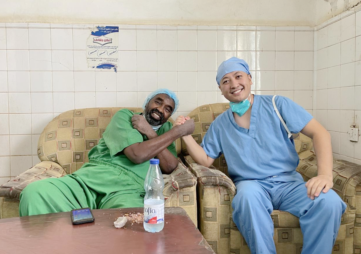 于永亮主任医师作为有“三次援非”、“夫妻援非(于主任的爱人是我院肾病科武雯主任医师,为第26批援苏丹医疗队队员)”等经历的老队员,拥有丰富的苏丹生活经验,对当地的人文及地理环境很熟悉,和苏丹,尤其是和苏丹阿布欧舍这个小镇的人民建立了深厚的感情。再次进入阿布欧舍住地后,主动帮助新队员了解新环境,开车带领新队员去市场采购生活物资,为队员适应新的工作生活环境起到了很大的作用。复工复诊后,积极开展工作,工作量很大,特别是外科病人多,手术量大。5、6月份是苏丹最热的月份,有时候气温可达45°C以上,戴着口罩,面屏及穿着隔离衣,即是在有空调的房间,也常常是汗流浃背,特别是手术室里只有一台空调,室温无法下降,一台手术下来,全身衣服湿透,只能在空调的出风口吹一下凉风。仅一个月,就处理门诊病人185人次,大小手术38例,其中各种疝手术11例,胆囊切除手术和甲状腺肿切除手术各1例。尽管小镇阿布欧舍经常停水停电,生活条件艰苦,但于主任从来没有怨言和不快,看着窗外近1米长的大蜥蜴,“这是给我站岗呢”,于主任幽默地说。