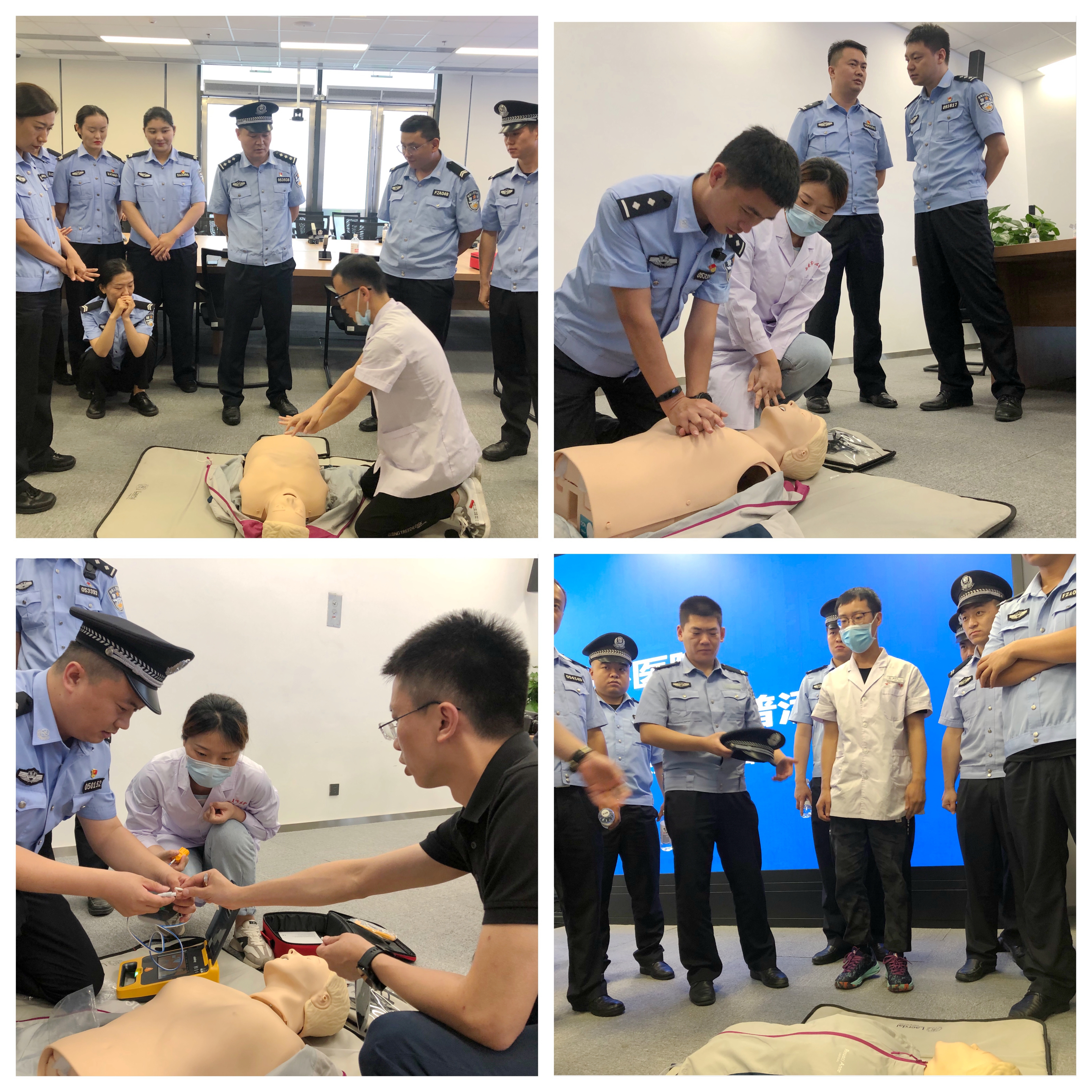 全科医学科主任王琦侠用生动风趣的语言向公安干警们讲解了心肺复苏的专业知识和AED的使用方法,并对公安干警们提出的疑惑进行了耐心和细致的解答。最后,全科医学科专家团队对奥体中心安保指挥中心的公安干警们进行了一对一的实操指导。