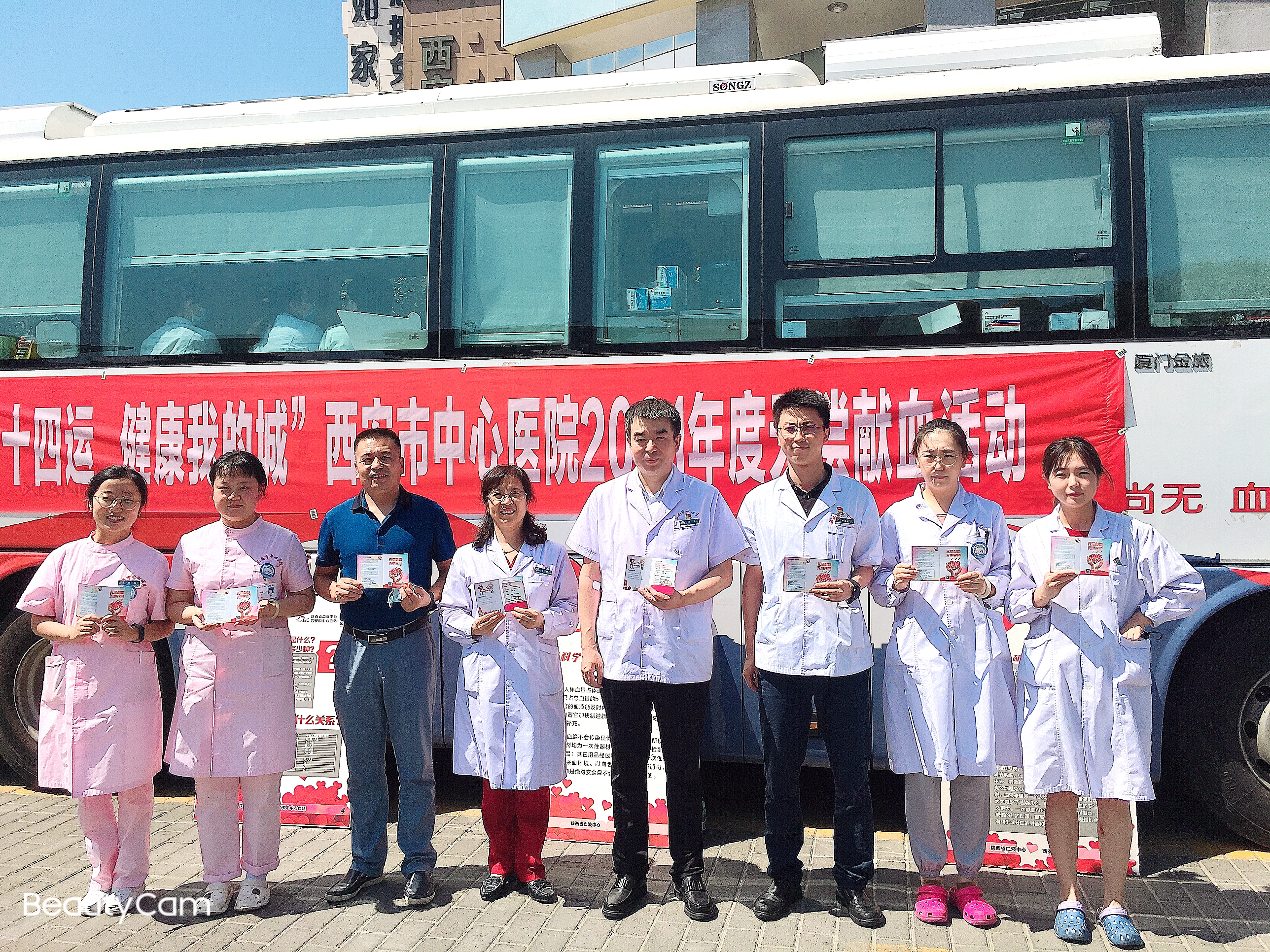 七月盛夏,烈日炎炎。院长虎威、党委书记王栋和医务科长黄新亲临现场指导献血工作,市中心血站陶梅书记为我院颁发了“2020年度西安市团体献血先进单位”奖牌。清晨,献血车还未就位,身着白大褂的工作人员们早已排起了长队,副院长郭华率先垂范,长时间手术后即刻带头参与献血;输血科张养民主任带领科室同志积极献血的同时全力协助采血工作的顺利开展;检验科副主任朱建伟一大早从公卫中心专程赶来献血,更多的主任和专家们,工作间隙来到献血车前,顶着烈日,抹着汗水,焦急而有序的等待献血,鼓舞着越来越多的年轻同志们不断参与进来。