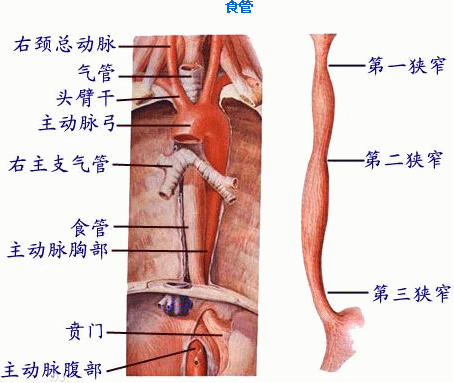食管有3个生理狭窄区:第一狭窄位于食管的起始端,即咽与食管的交接处,此处容易出现食物崁顿;第二狭窄位于左支气管跨越食管处;第三狭窄在食管通过膈肌的裂孔处。