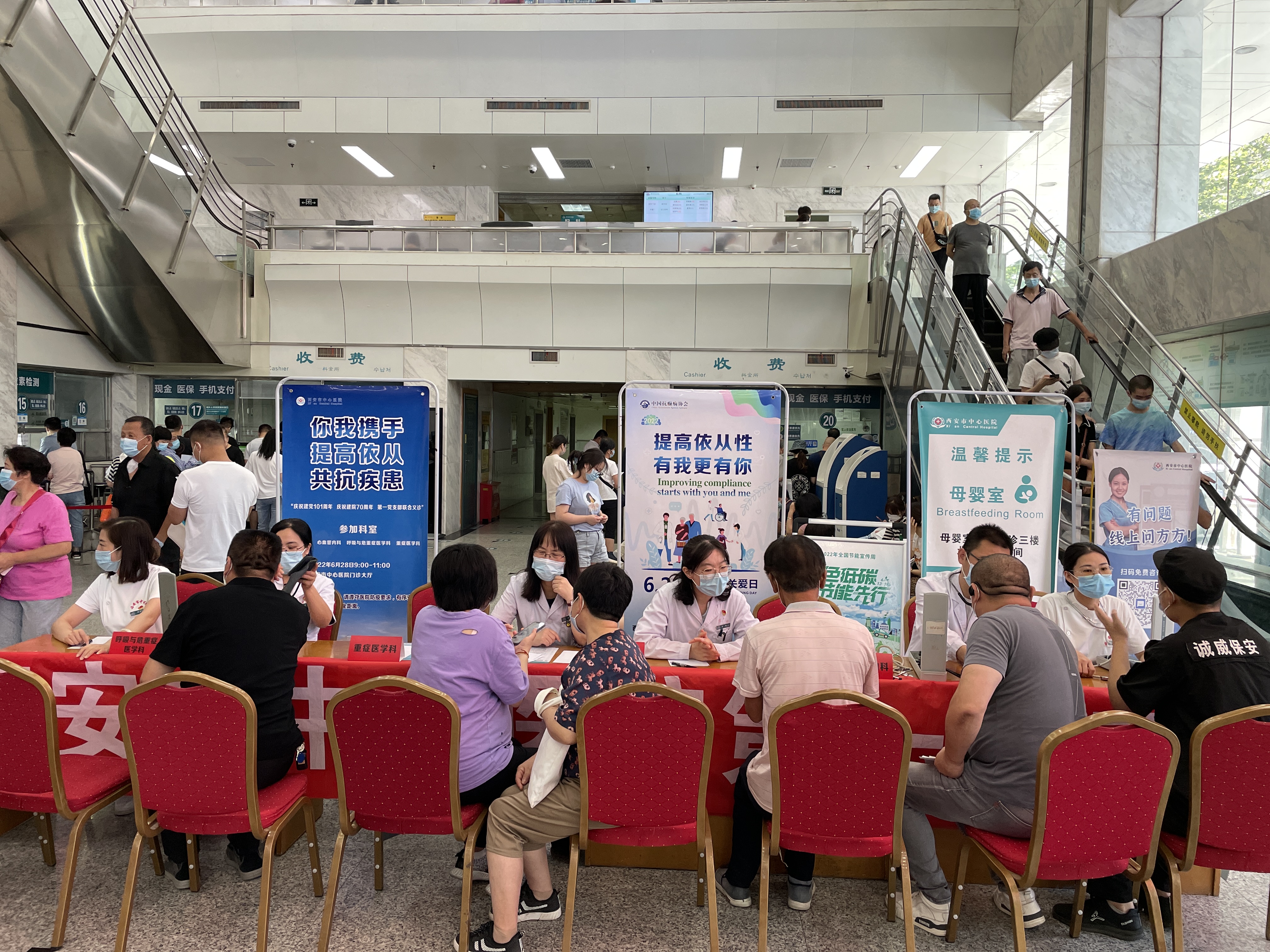 炎炎夏日,酷暑难耐,但前来义诊的患者络绎不绝,一支部樊丽华书记,支委组织委员杨莉护士长,宣传委员周彦芝护士长,纪委委员张涛主任医师,青年委员贾晓涛副主任医师,神经内科狄政莉主任,党小组长蒋毅副主任医师,重症医学科党小组长米婷主治医师,呼吸危重症王波主治医师及各科积极分子,骨干护士十余人参加义诊。各位专家对前来义诊的每一位患者答疑解惑,提供免费健康咨询和健康监测、指导多种慢性疾病的药物应用、普及患者居家生活注意事项、传达科学康复理念,用自己丰富的临床经验为其制定个体化的健康管理方案。