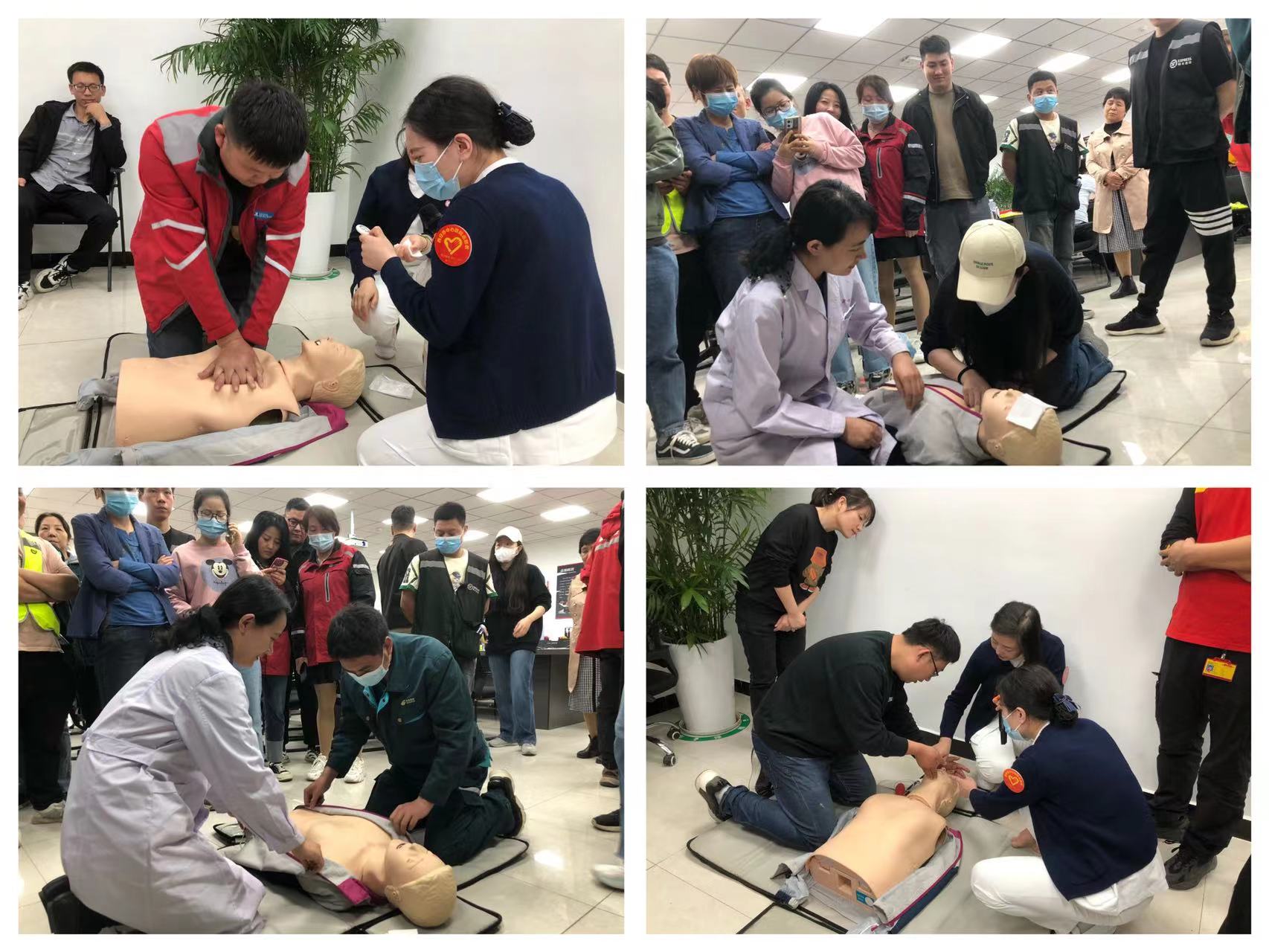 随后,周彦芝护士长带领的团队组织大家进行徒手心肺复苏实操演练,从理论到实战,层层递进,员工们学习兴趣高涨,积极踊跃地参加实操练习,医护人员对快递“小哥”进行“手把手”的指导和讲解,对细节进行一一纠正,互动频频,员工们表示收获满满。