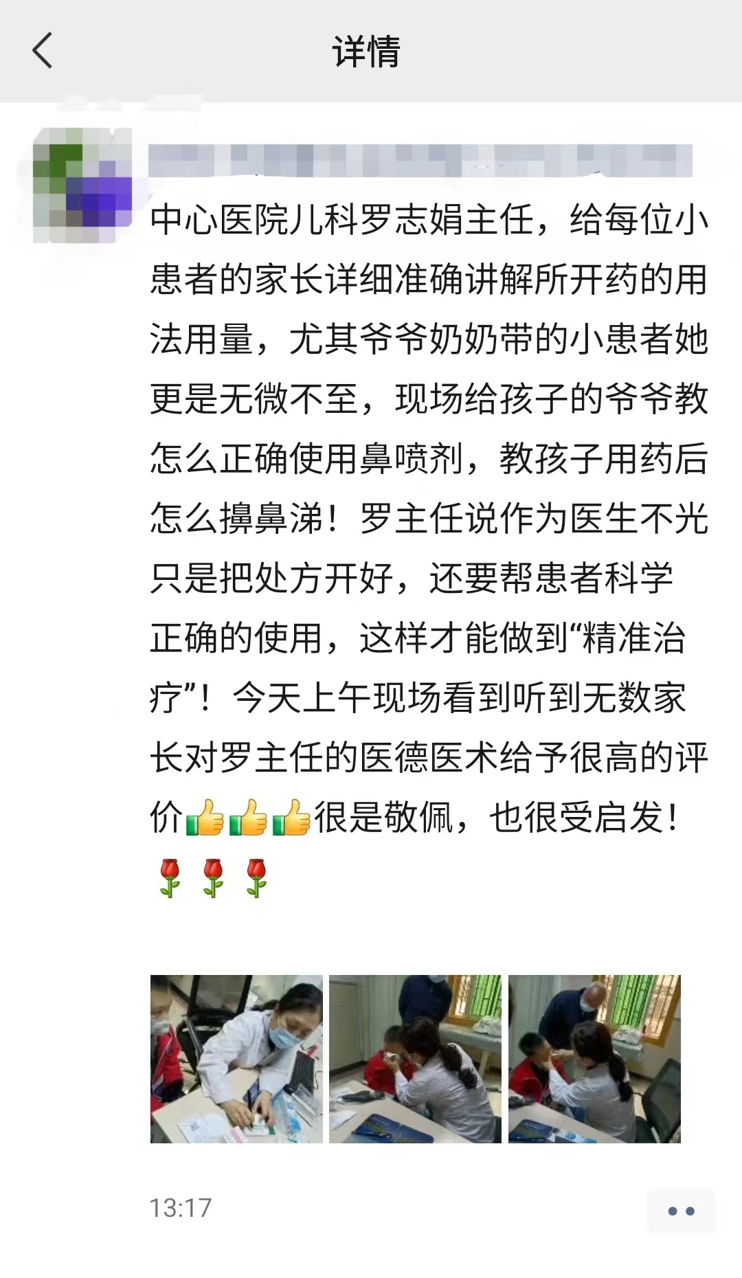 这样的温柔细语,一整天都充斥在儿科门诊诊室里。儿科专家门诊室里罗志娟主任正在为一名前来就诊的患儿家属讲解药物的用法,使用时间,直到这位患儿家长能自己重复一遍后,才“放”他们离开诊室。她每次为患儿听诊时,都得先用手心的温度把听诊器前端捂热了再放进患儿的衣服里。早上来门诊时带的一杯热茶,门诊结束时茶还是那杯茶,还在那个地方,变成了凉茶。有人因此拍下了温馨的一幕发了朋友圈,迎来了大家一致的点赞。