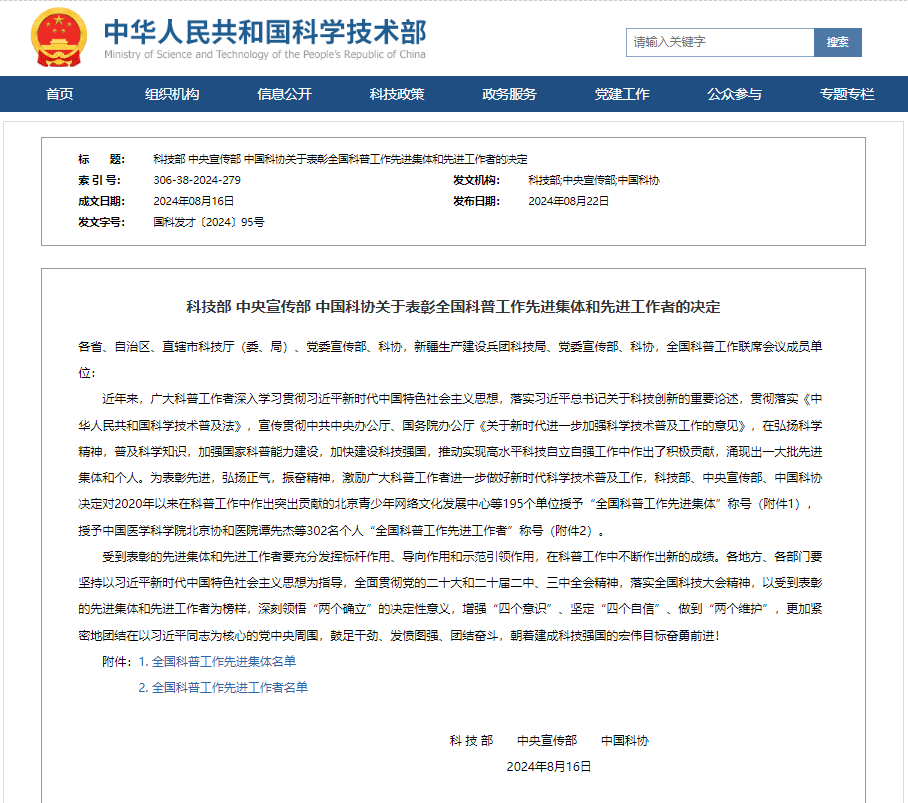 近日,科技部、中央宣传部、中国科协公布了关于表彰全国科普工作先进集体和先进工作者的决定,91论坛 眼科获全国科普工作先进集体!