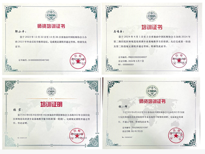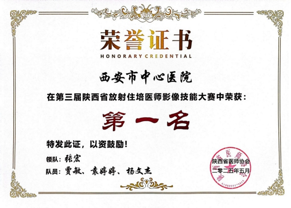 辛苦付出定有回报,已培训完成的放射科专业住培医师100%通过国家住培结业考试成绩优异,基地在2025年及2024年陕西省医师协会放射分会住培医师影像技能大赛中,分别荣获大赛第一名及第二名。