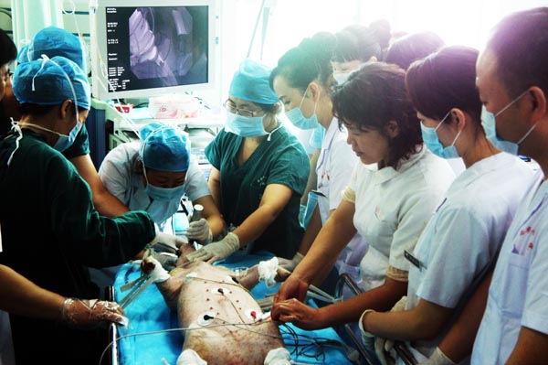 2012年6月9日星期六上午,消化内镜中心成功实施首例活体猪胃内镜黏膜下剥离术(ESD)。 在宋瑛主任主持下,我院麻醉科积极配合,术前做了充分的准备,针对ESD的手术指征及各种可能出现的并发症进行了详细的讨论,制定了慎密的实施方案。实验中4名高年资消化科医师对活体猪成功实施了4次ESD手术,手术顺利,历时共约3小时左右,术后创面清晰,没有出血及穿孔,标本完整。动物术后恢复良好,1天后恢复进食,无术后出血及穿孔等并发症。 内镜黏膜下剥离术(endoscopic submucosal dissection,ESD)是利用多种内镜用器械切开病变周围黏膜,沿着黏膜下层进行剥离的切除病变的一种治疗方法。适用于直径大于2cm的消化道巨大平坦息肉、早期癌和粘膜下肿瘤的切除,可完整大块地切除病变,达到与外科手术同样的根治效果。最重要的是患者无需剖腹手术,降低了传统手术治疗的风险,免除了术后对生活质量的影响,这种称为ESD的手术模式,已成为治疗消化道肿瘤的前沿趋势,在国内外已被广大患者所接受,并带来了良好疗效。 ESD技术难度与风险较大,代表了消化内镜微创治疗的未来发展方向。我院消化内镜中心在省内较早开展ESD技术的探索,此次活体猪ESD手术成功实施,使我院内镜下微创治疗技术水平迈上了新台阶,为我院以后对消化道早癌及癌前病变的诊治达到国内先进水平做好了准备,为消化道疾病患者治疗提供了更好的选择。