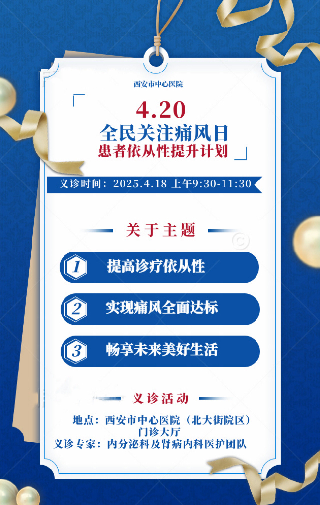 义诊内容:高尿酸血症及痛风咨询、内分泌代谢性疾病及肾病咨询、免费血压血糖检测、免费发放科普资料