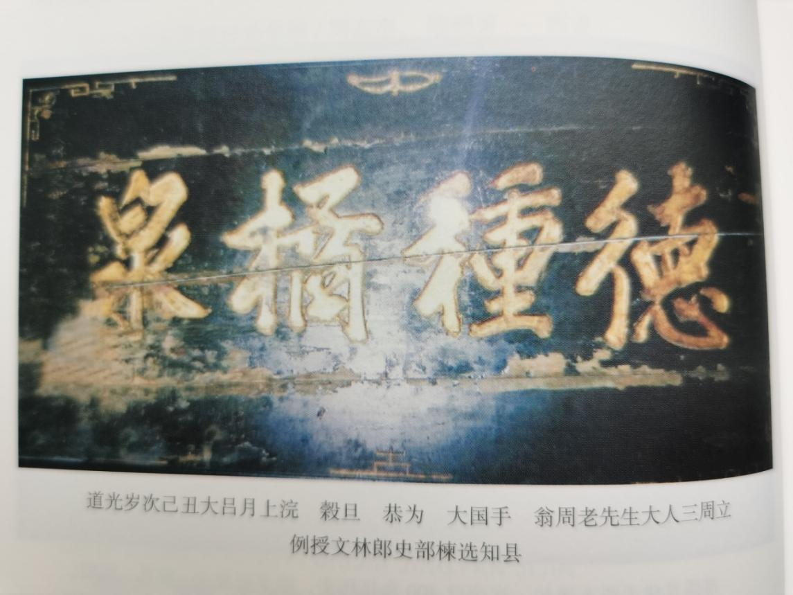 第一块:上毂“道光岁次乙丑大吕上月浣毂旦恭为:大国手¨翁周老先生德種橘泉;”下毂“例授文林郎吏部楝選知县(余字不可辨识)”。这块牌匾为周元贞老先生(道光九年)为一知县看病后,知县所送牌匾。