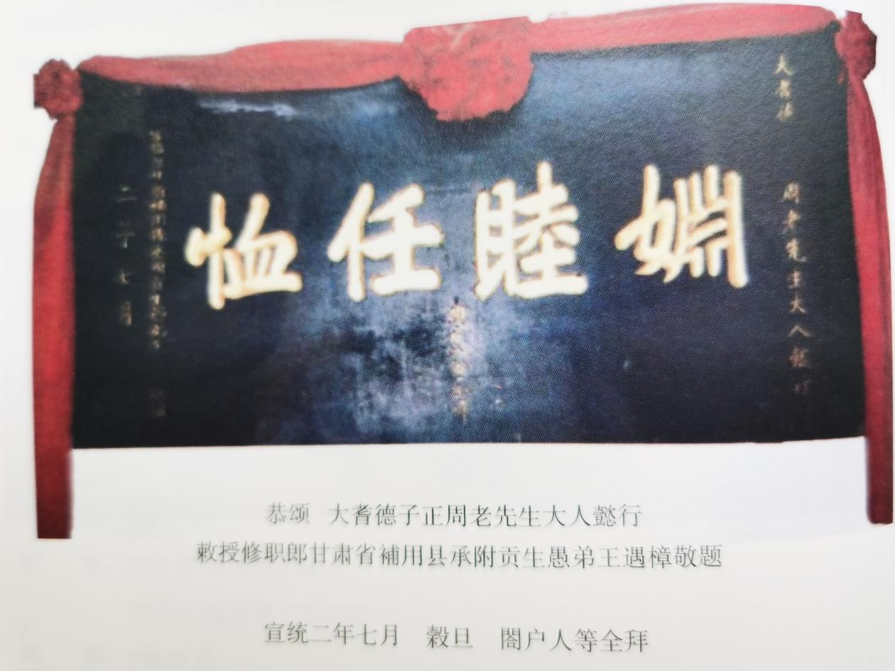 第二块牌匾:上毂“大耆德子正周老先生大人懿行。姻睦任恤”,下毂“修职郎甘肃补用县承附贡生王遇章弟敬题。宣统二年七月旦毂。”这块牌匾为周元贞老先生为外省补用县承诊病后,所得病人题匾。说明周家准绳堂不仅在当地名望高,而且在西北也有很高声望。