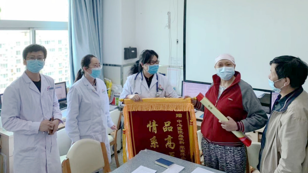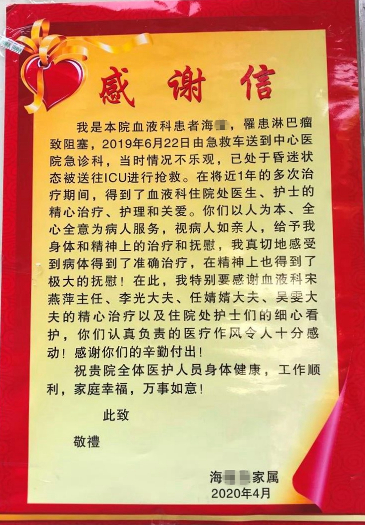 同样地,海女士罹患滤泡淋巴瘤,该患者由救护车送来我院急诊科,已处于昏迷状态的患者收住重症医学科,经市中心医院血研所会诊并进行积极的联合抢救,患者病情逐渐稳定,后于血研所规律住院化疗,最终疾病达完全缓解,获得非常好的治疗效果。“你们以人为本,我真切的感受到病体得到了准确的治疗,精神上得到了极大的抚慰!是你们给了我第二次生命,医生不是神仙,但是你们就是我的幸运之神!”患者激动的感谢着宋艳萍主任、任婧婧副主任医师、李光副主任医师、吴雯医师以及血研所全体护理人员。