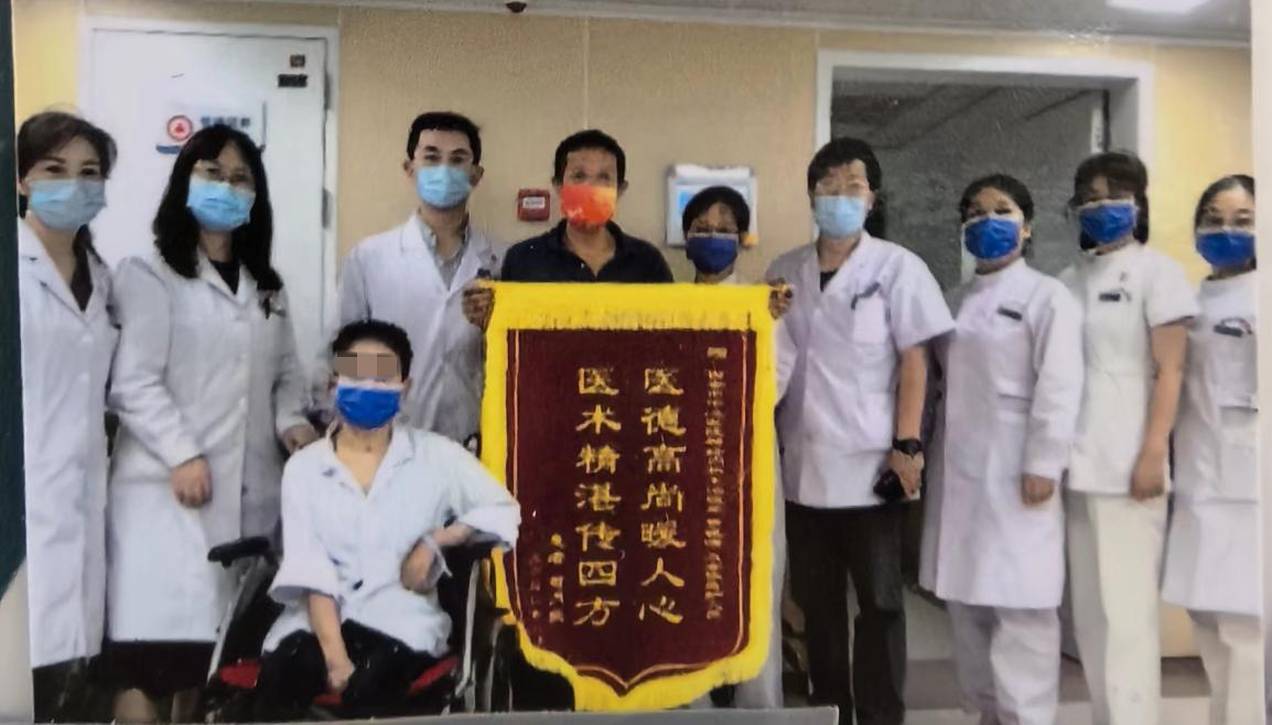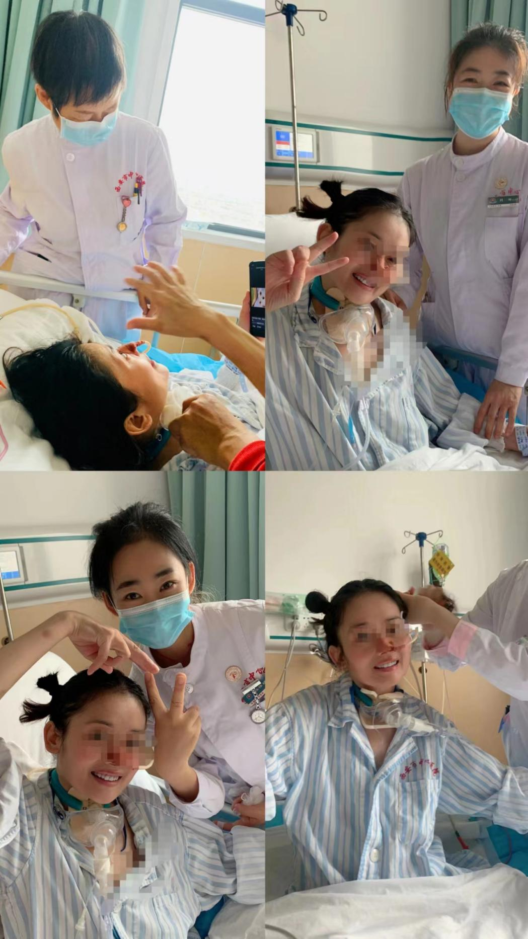 之后,这位妈妈一天天地好转,已无生命危险,转到病区66床继续治疗。得知她家经济拮据,热心的同事们自发捐款,还有同事给孩子送吃的和衣服,有的帮她买尿不湿,为她解决燃眉之急。她也渐渐地消除愁容,积极参与康复训练,我们每天指导她呼吸功能训练和有效咳嗽,一周后气管堵管成功,顺利拔管。两周之后,由于下肢瘫痪长期坐轮椅自带的骶尾部压力性损伤也完全愈合。出院前,完成利妥昔单抗治疗后的她精神格外好、笑容满面、容光焕发,我们帮她梳妆漂亮的丸子头合影留念。