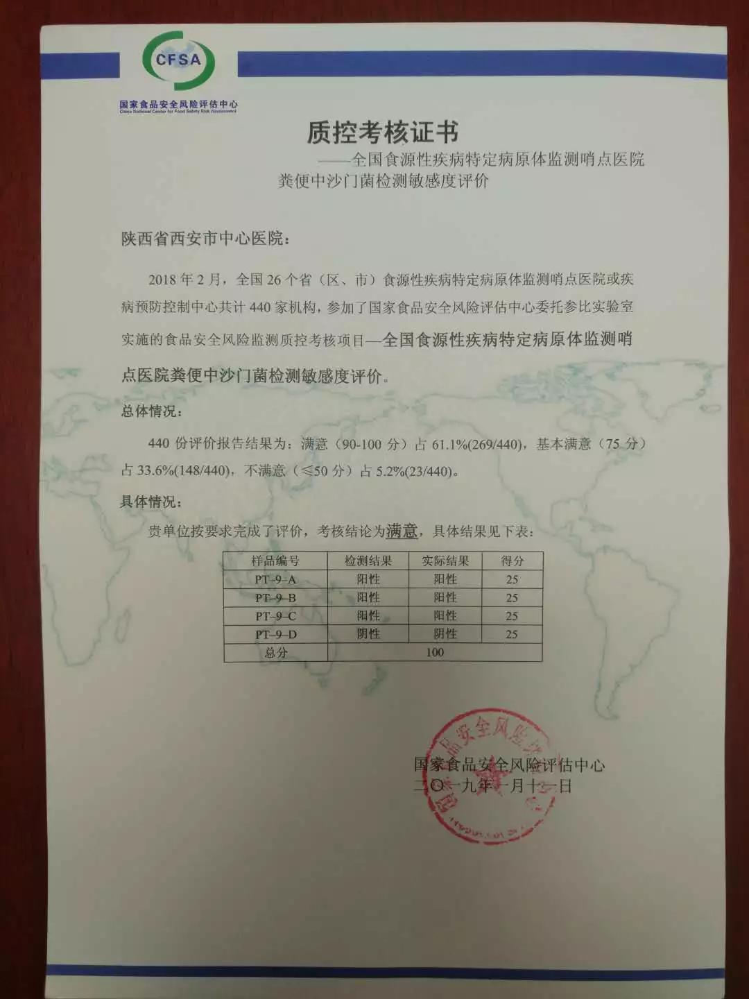 2018年2月,全国26各省(区、市)食源性疾病特定病原体监测哨点医院或疾病预防控制中心共计440家机构,参加了国家食品安全风险评估中心委托参比实验室实施的食品安全风险监测质控考核项目——全国食源性疾病特定病原体监测哨点医院粪便中沙门菌监测敏感度评价。西安市仅有2家医院获得“质控考核证书”,我院即为其中一家。我院检验科朱建伟和李楠两位同志参加该考核项目取得满意结果,荣获“优秀个人奖”。