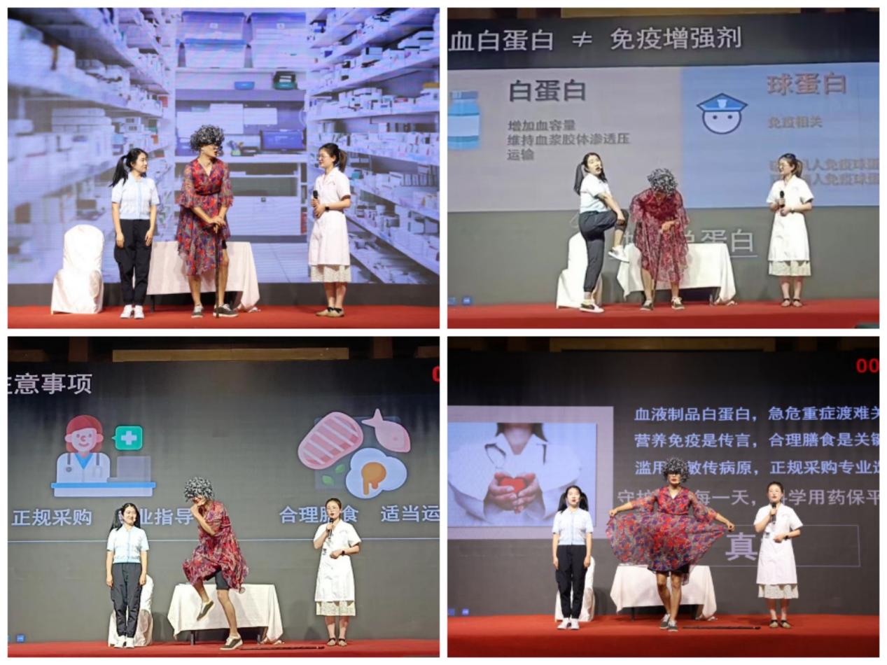 我院参加本次比赛的药师团队由王源、雷露、李东阳、丁婕、杨林等药师组成,他们的参赛作品《人血白蛋白的真相》以幽默风趣的情景剧形式、通俗易懂的语言内容展现在评委和观众面前。情景剧从人血白蛋白的临床应用到应用中产生的误区,从产生的用药误区到滥用引发的危害,环环相扣,内容俏皮又不失严谨,形式活泼但发人深省,得到了评委专家和现场观众的一致好评。