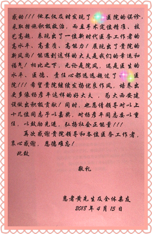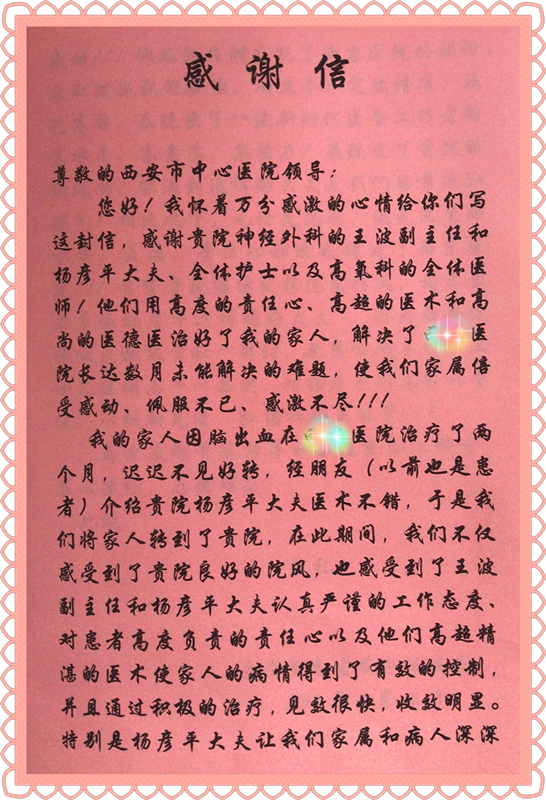 近日,市中心医院收到一封患者感谢信,信中高度赞扬我院神经外科王安生主任团队下的王波、杨彦平医生、科室护士以及高压氧科医生,用高度的责任心、高超的医术和高尚的医德医治好了一位转院病人,解决了在西安某三甲医院长达数月未能解决的难题。收到来信后,我院立即组织了解患者就医情况,及时发掘身边闪光点,为人民群众提供高超医术和优良服务水平提供标杆。