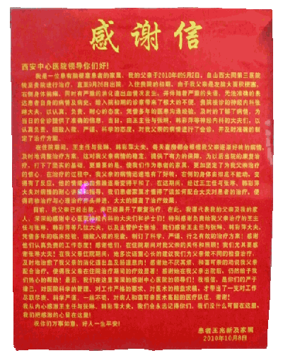 91论坛 领导你们好: 我是一位患有脑梗塞患者的家属,我的父亲于2010年的9月2日,自山西大同第三医院转至贵院进行治疗,直至9月26日出院。 ![]() 入住贵院的初期,由于我父亲是左脑大面积梗塞,右侧身体偏瘫,同时又严重的消化道出血情况发生,并伴随着严重的失语,无法准确的表达患者自身的病情及病史,给入院初期的诊察带来了极大的不便 。贵院接诊的神经内科张琳大夫,以认真、负责、耐心的态度,凭借多年的医患沟通经验,及时的了解了病情,为当日的会诊提供了准确的信息。当日,凭借着王主任与张琳、韩彩萍等神经内科的大夫们认真负责、细致入微、严谨、科学的态度,对我父亲的病情进行了会诊,并及时准确的制定了治疗方案。 在住院期间,王主任与张琳、韩彩萍大夫,每天查房都会根据我父亲逐渐好转的病情,及时地调整治疗方案,这对我父亲病情的稳定,提供了有力的保障,为以后出院的康复治疗,打下了坚实的基础,更重要的是:我们作为患者的家属,更加坚定了为我父亲治疗的信心。在治疗的过程中,我父亲的病情迅速好转,右侧的身体由彻底不能动变得有了反应,他的情绪也由焦躁变得平和了。在这期间,王主任与张琳、韩彩萍大夫对病情的耐心讲解和指导,我们患者家属才懂得了该如何配合大夫对患者的治疗,使得药物治疗与心理治疗齐头并进,大大的提高了治疗效果 目前,我父亲已经出院,并已展开了康复治疗。在此,我谨代表我的父亲及我的家人,深深的感谢中心医院神经内科的大夫们和护士们!特别感谢负责给我父亲治疗的王主任与张琳、韩彩萍大夫,以及主管护士张培。我们感谢王主任与张琳、韩彩萍大夫凭借多年的临床经验,细致入微观察,制定了科学、严谨、行之有效的治疗方案!感谢他们认真负责的工作态度!感谢他们,在我父亲住院期间的关怀和照顾!我们尤其要感谢张琳大夫!在我父亲住院期间,她多次语重心长的建议我们为父亲做不同的检查治疗,及时地治疗了我父亲的消化道出血及肠道息肉!感谢她不厌其烦、和蔼可亲的劝说我父亲配合治疗,使得我父亲在住院治疗期间的疗效显著!感谢她在我父亲出院后,仍然给予我们热心的帮助!最后,我们深深地感谢中心医院的领导们!我相信,是你们的严于律己,对医院科学的管理、对工作严格的要求、对医术的精益求精,才带出了一支对工作尽职尽责、科学严谨、一丝不苟,对病人和蔼可亲医术高超的医疗队伍。谢谢! 我从内心感激王主任与张琳、韩彩萍大夫,我们会永远记得你们。我们没什么可留在这里,我们把感激的心留在这里! 祝你们万事如意,好人一生平安! 患者王兆新及家属 2010-10-08  |