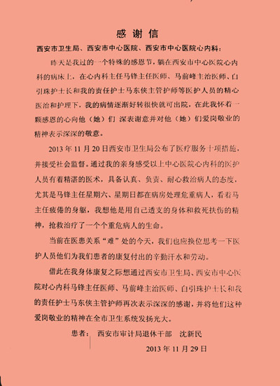 感谢心内科马锋主任、马前峰、白引珠、马东霞等医护人员