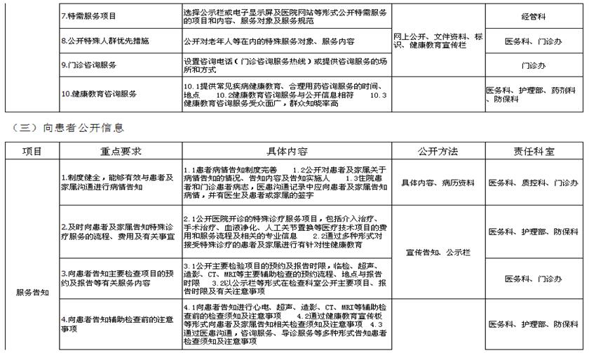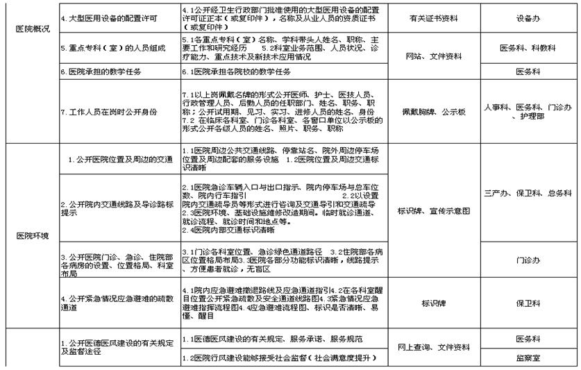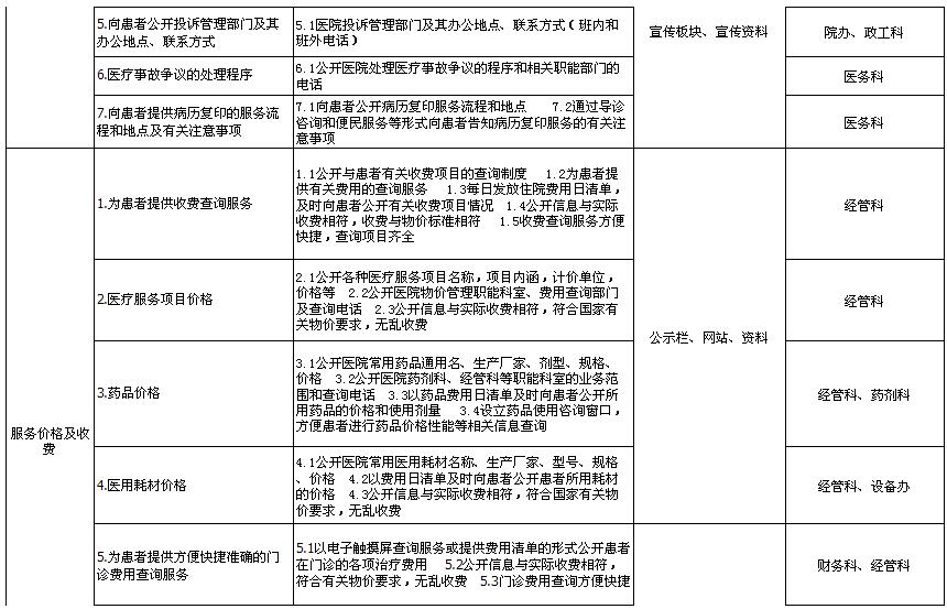 1.在挂号室、收费处、各功能检查科室、门诊诊室、治疗室等服务窗口的醒目位置设立公开专栏,公开本科人员情况,技术特长、设备性能、服务项目、收费标准、就诊程序。