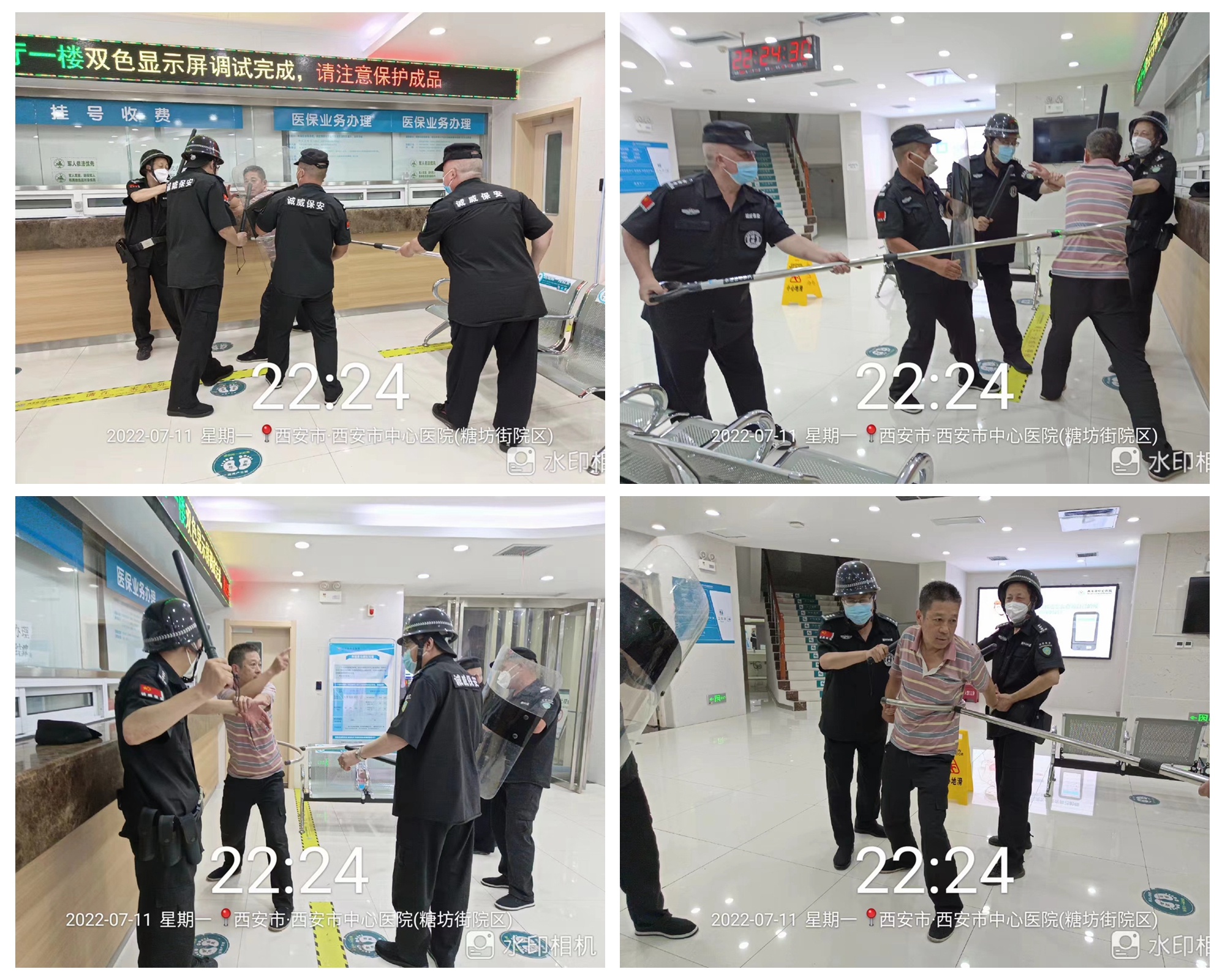 为深化“平安医院”建设,保障医患平安,强化医务人员的安全防范意识和处置突发暴恐事件的应急能力,7月11日、13日,在虎威院长安排、成小勇副院长的组织下,市中心医院保卫科联合保安队分别在南院区、北院区、糖坊街院区开展了反恐防暴应急演练。